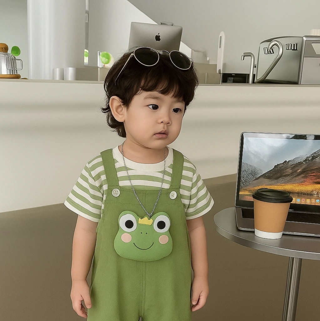 Bring out your little oneβs playful side with this charming Green Frog Dungaree Set! Featuring a striped t-shirt paired with cheerful frog-face overalls, this outfit is perfect for warm days, outings, and photo sessions.